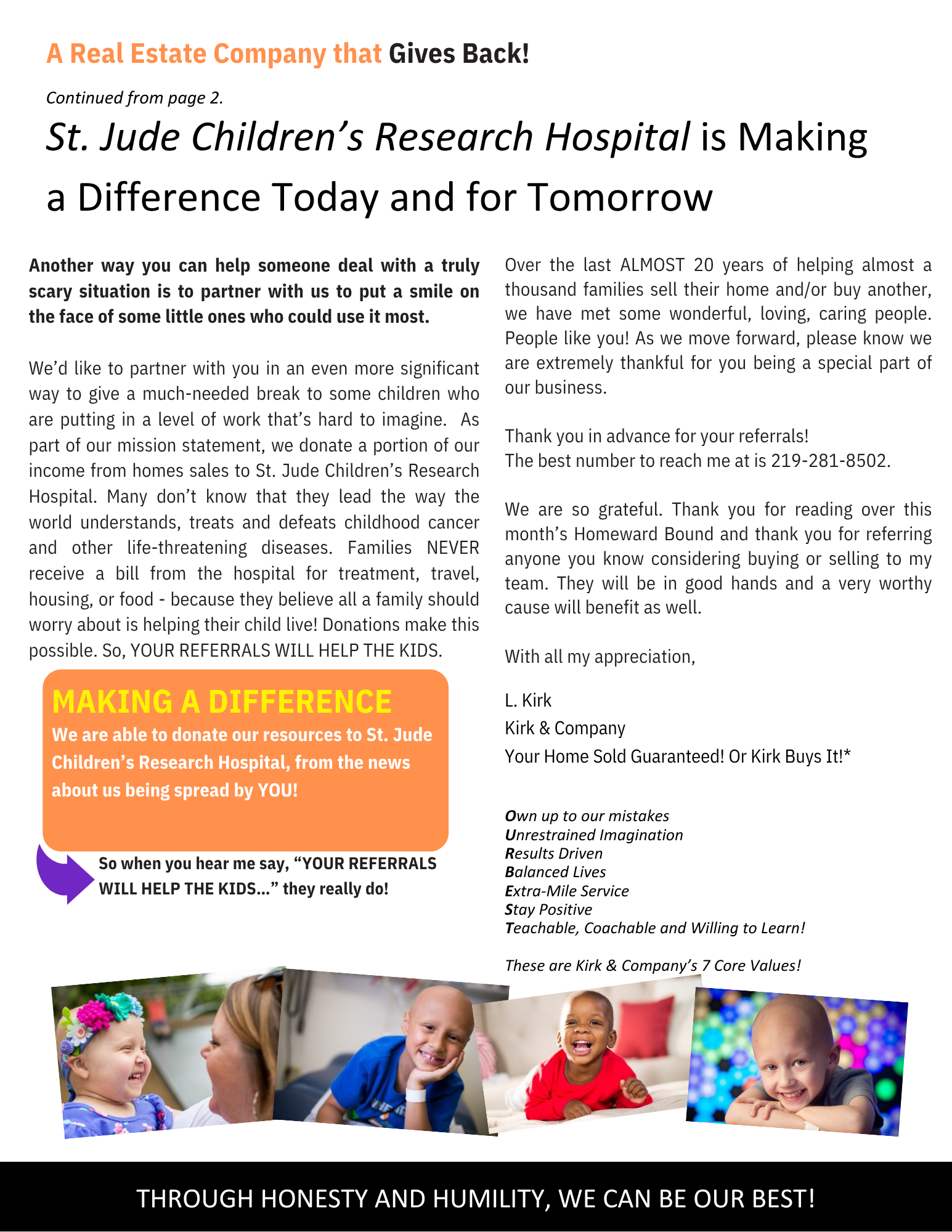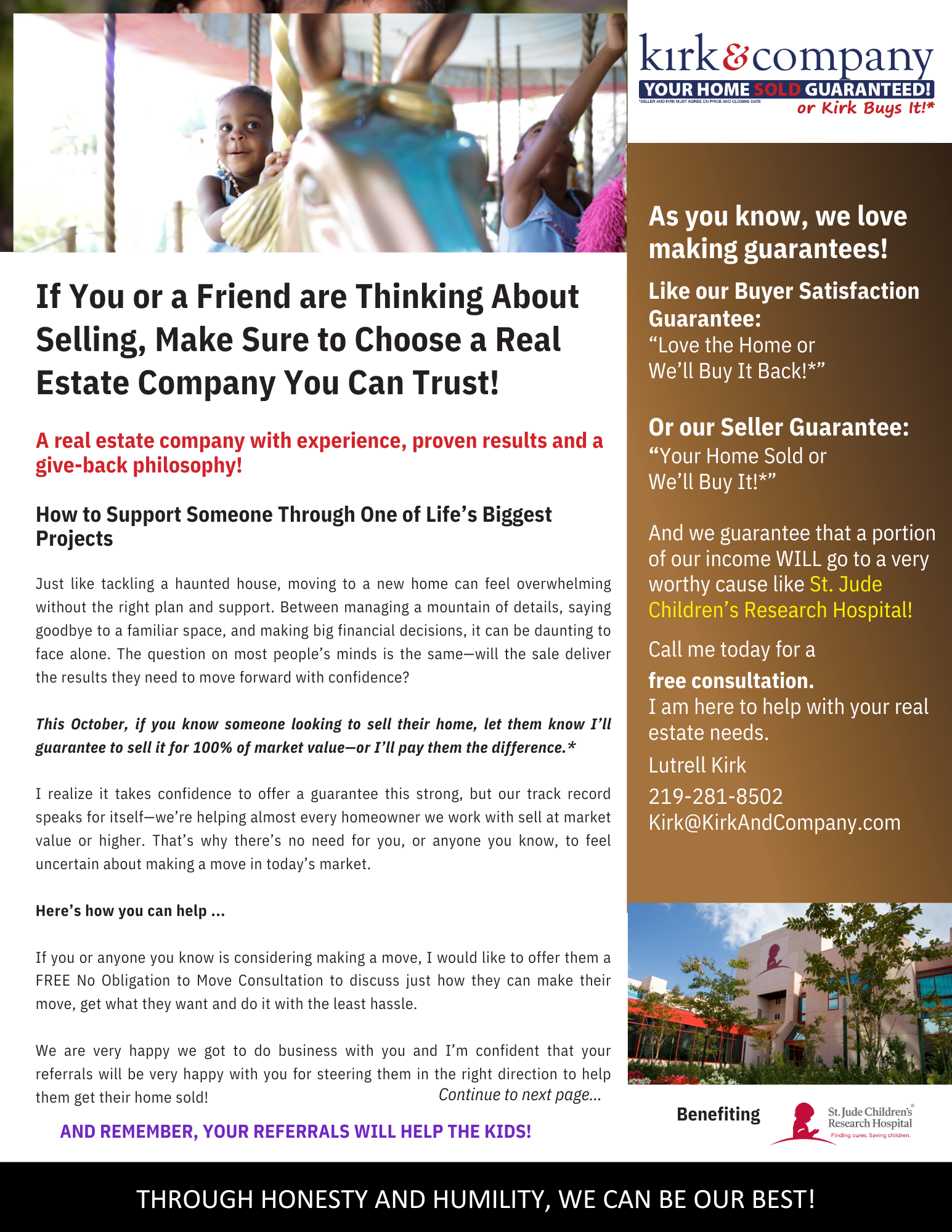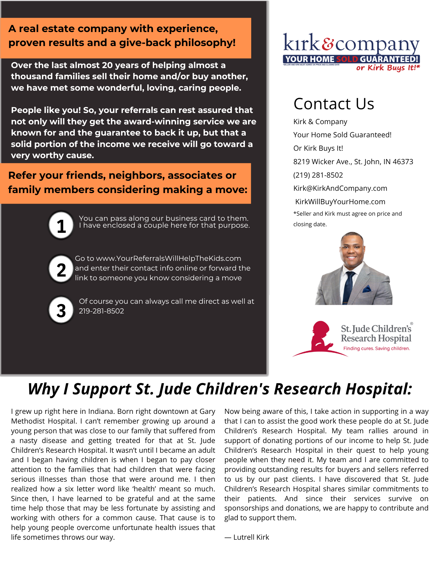 Who do you know considering buying or selling a home you could refer to my real estate sales team? When you refer them, everyone wins: your friend gets award-winning real estate service and St. Jude Children’s Research Hospital receives a donation that helps the kids.